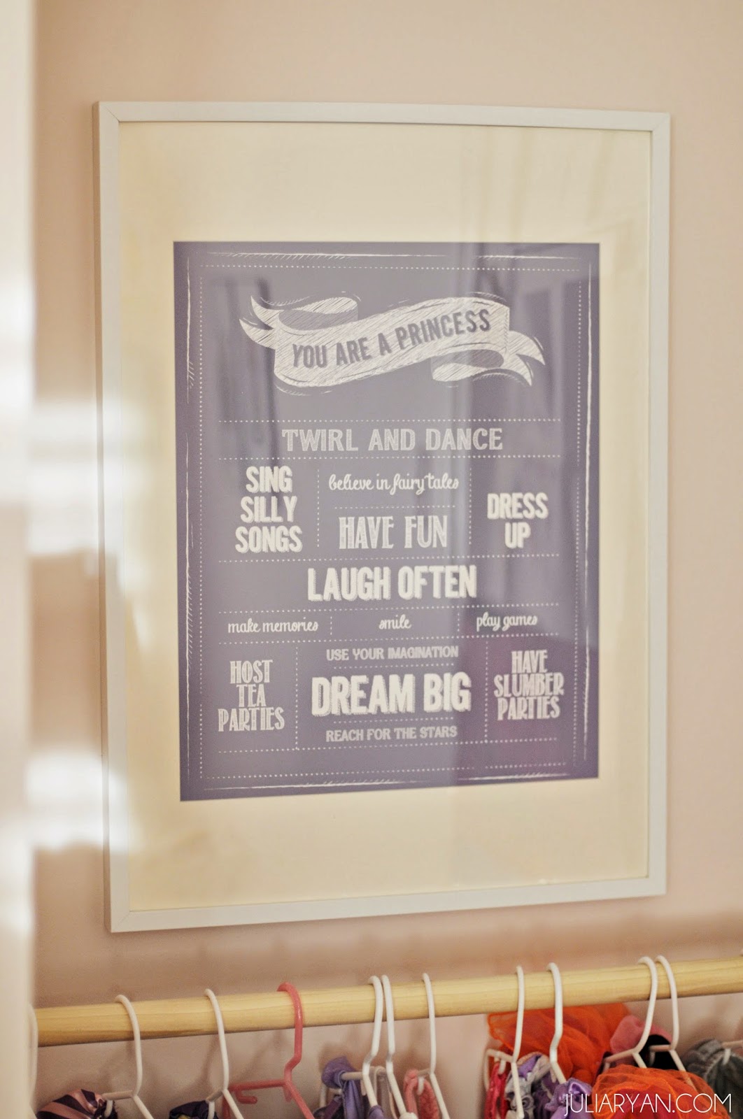 Because the clothes bar was hung low enough for easy child access we had a big blank space on the wall right at grown up eye level. I wanted something bold enough to carry weight but not too busy. The dress up is the star of the show. I'm so in love with our purple You Are A Princess print from Uh Oh Pasghettio. What a fun addition to any girls's room, but especially a princess corner. We went with the 16x20 and popped it straight into an ikea ribba frame. Done.